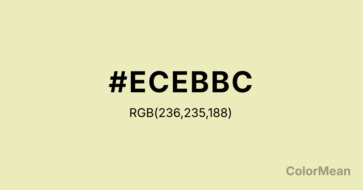 #ECEBBC RGB value is (236, 235, 188). The hex color red value is 236, green is 235, and blue is 188. Its HSL format shows a hue of 59°, saturation of 56 percent, and lightness of 83 percent. The CMYK process values are 0 percent, 0 percent, 20 percent, 7 percent.