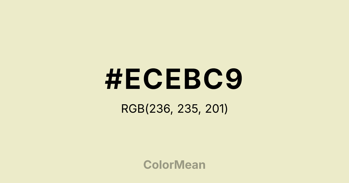 #ECEBC9 RGB value is (236, 235, 201). The hex color red value is 236, green is 235, and blue is 201. Its HSL format shows a hue of 58°, saturation of 48 percent, and lightness of 86 percent. The CMYK process values are 0 percent, 0 percent, 15 percent, 7 percent.