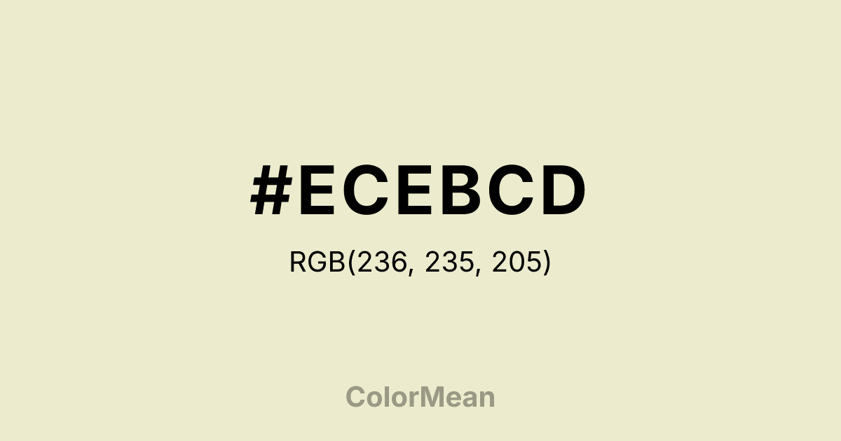 #ECEBCD RGB value is (236, 235, 205). The hex color red value is 236, green is 235, and blue is 205. Its HSL format shows a hue of 58°, saturation of 45 percent, and lightness of 86 percent. The CMYK process values are 0 percent, 0 percent, 13 percent, 7 percent.
