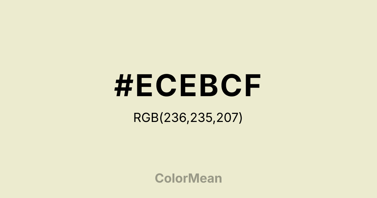#ECEBCF RGB value is (236, 235, 207). The hex color red value is 236, green is 235, and blue is 207. Its HSL format shows a hue of 58°, saturation of 43 percent, and lightness of 87 percent. The CMYK process values are 0 percent, 0 percent, 12 percent, 7 percent.