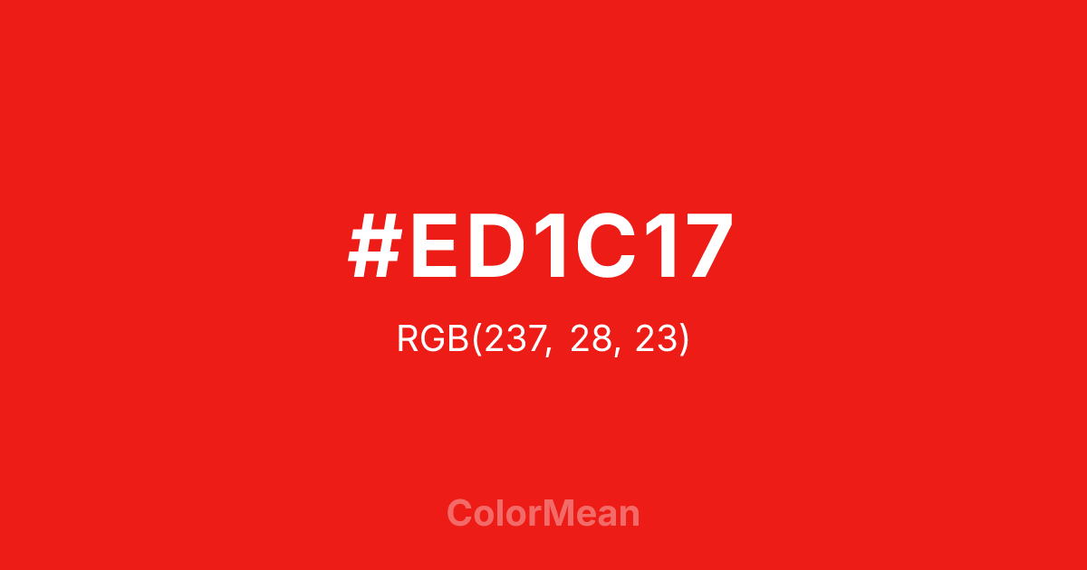 #ED1C17 RGB value is (237, 28, 23). The hex color red value is 237, green is 28, and blue is 23. Its HSL format shows a hue of 1°, saturation of 86 percent, and lightness of 51 percent. The CMYK process values are 0 percent, 88 percent, 90 percent, 7 percent.
