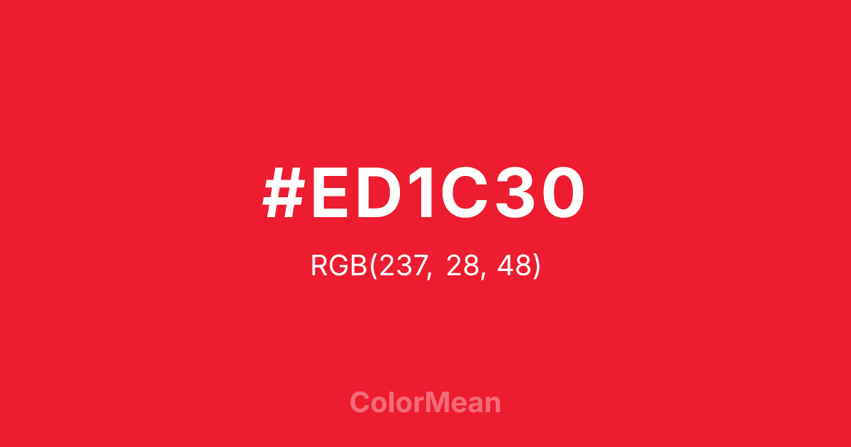#ED1C30 RGB value is (237, 28, 48). The hex color red value is 237, green is 28, and blue is 48. Its HSL format shows a hue of 354°, saturation of 85 percent, and lightness of 52 percent. The CMYK process values are 0 percent, 88 percent, 80 percent, 7 percent.