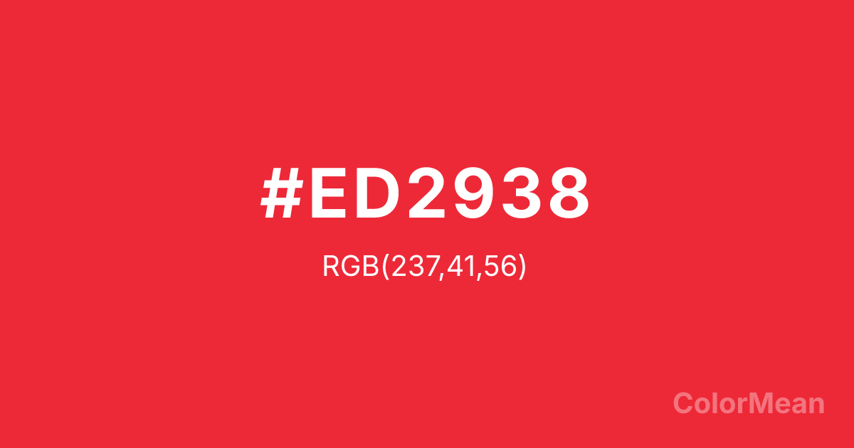 #ED2938 RGB value is (237, 41, 56). The hex color red value is 237, green is 41, and blue is 56. Its HSL format shows a hue of 355°, saturation of 84 percent, and lightness of 55 percent. The CMYK process values are 0 percent, 83 percent, 76 percent, 7 percent.