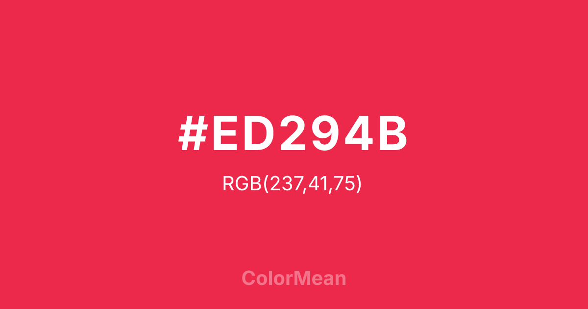 #ED294B RGB value is (237, 41, 75). The hex color red value is 237, green is 41, and blue is 75. Its HSL format shows a hue of 350°, saturation of 84 percent, and lightness of 55 percent. The CMYK process values are 0 percent, 83 percent, 68 percent, 7 percent.