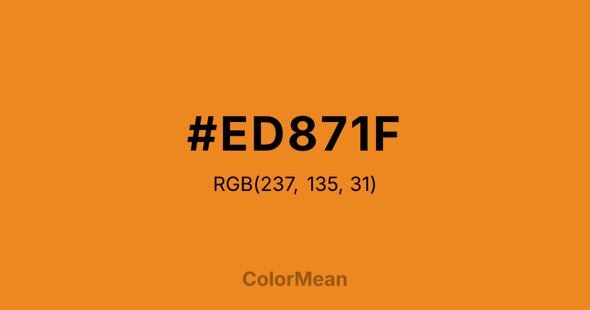 #ED871F RGB value is (237, 135, 31). The hex color red value is 237, green is 135, and blue is 31. Its HSL format shows a hue of 30°, saturation of 85 percent, and lightness of 53 percent. The CMYK process values are 0 percent, 43 percent, 87 percent, 7 percent.