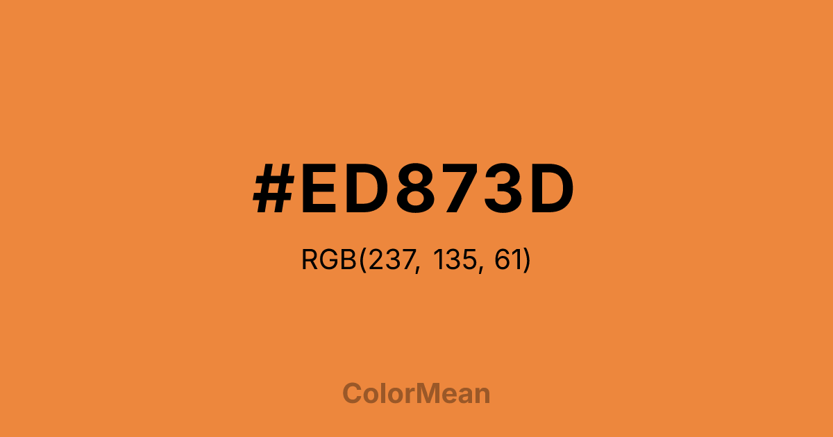 #ED873D RGB value is (237, 135, 61). The hex color red value is 237, green is 135, and blue is 61. Its HSL format shows a hue of 25°, saturation of 83 percent, and lightness of 58 percent. The CMYK process values are 0 percent, 43 percent, 74 percent, 7 percent.