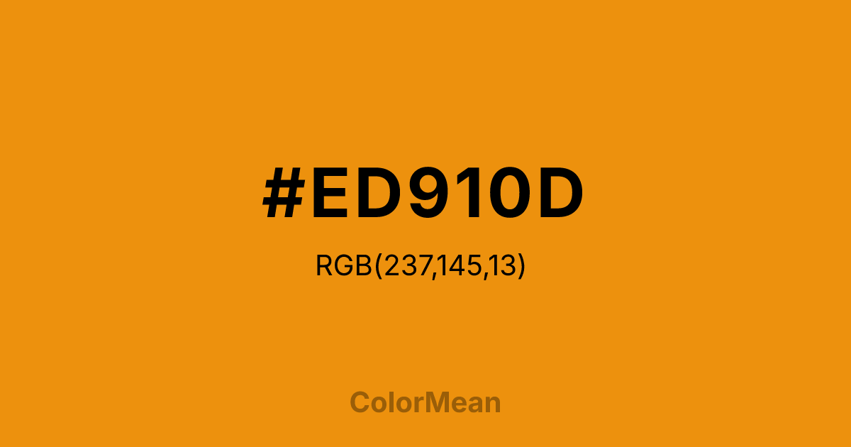 #ED910D RGB value is (237, 145, 13). The hex color red value is 237, green is 145, and blue is 13. Its HSL format shows a hue of 35°, saturation of 90 percent, and lightness of 49 percent. The CMYK process values are 0 percent, 39 percent, 95 percent, 7 percent.