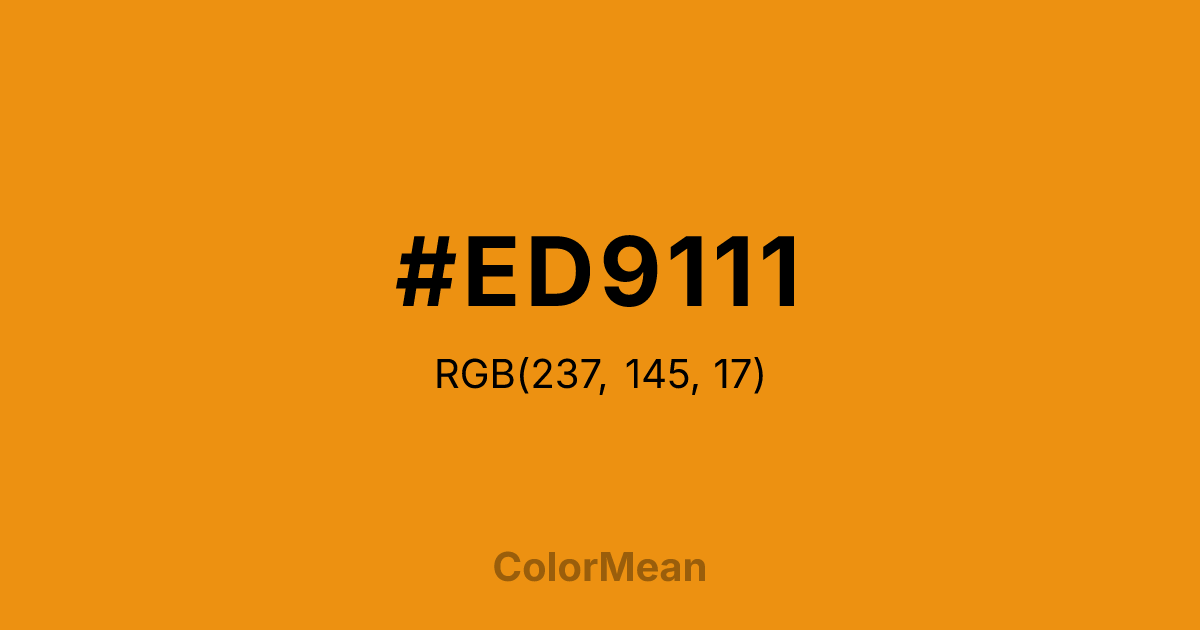 #ED9111 RGB value is (237, 145, 17). The hex color red value is 237, green is 145, and blue is 17. Its HSL format shows a hue of 35°, saturation of 87 percent, and lightness of 50 percent. The CMYK process values are 0 percent, 39 percent, 93 percent, 7 percent.
