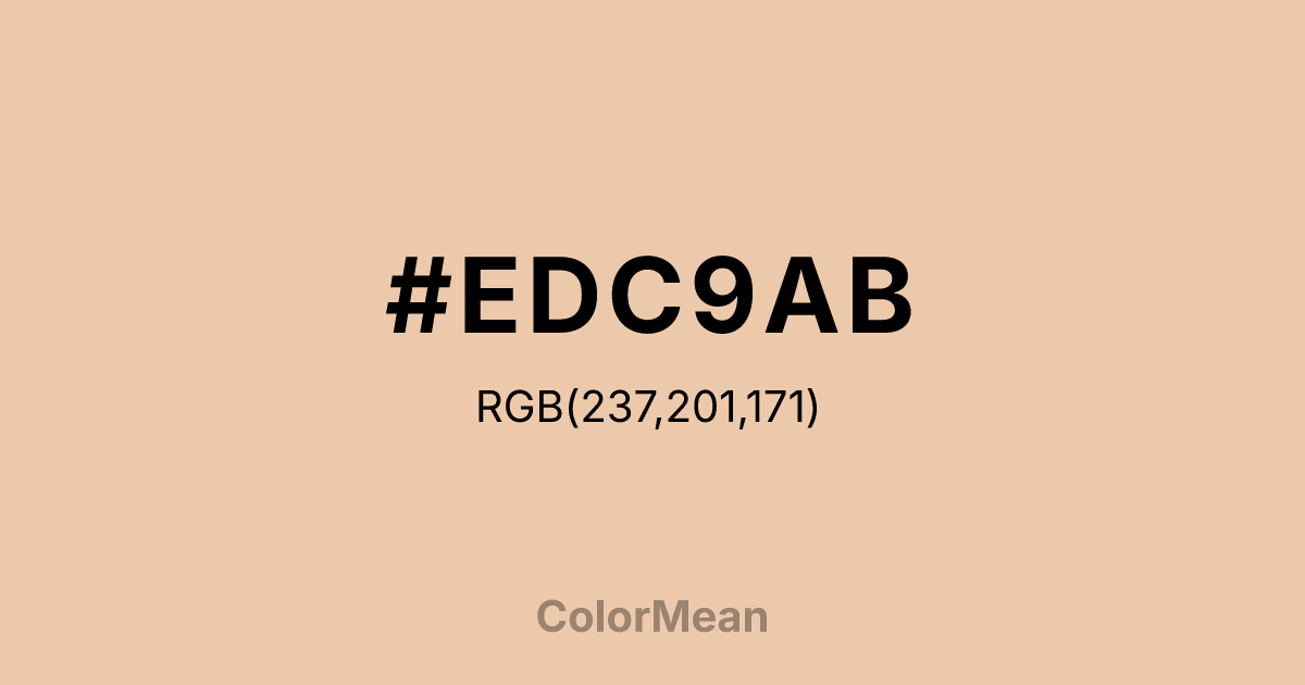 #EDC9AB RGB value is (237, 201, 171). The hex color red value is 237, green is 201, and blue is 171. Its HSL format shows a hue of 27°, saturation of 65 percent, and lightness of 80 percent. The CMYK process values are 0 percent, 15 percent, 28 percent, 7 percent.