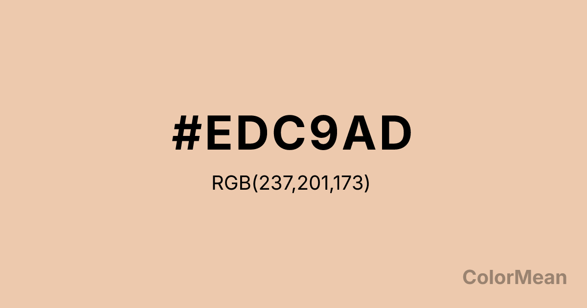 #EDC9AD RGB value is (237, 201, 173). The hex color red value is 237, green is 201, and blue is 173. Its HSL format shows a hue of 26°, saturation of 64 percent, and lightness of 80 percent. The CMYK process values are 0 percent, 15 percent, 27 percent, 7 percent.