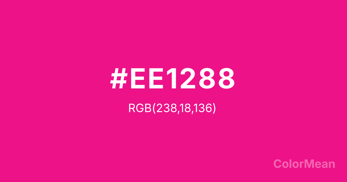 #EE1288 RGB value is (238, 18, 136). The hex color red value is 238, green is 18, and blue is 136. Its HSL format shows a hue of 328°, saturation of 87 percent, and lightness of 50 percent. The CMYK process values are 0 percent, 92 percent, 43 percent, 7 percent.
