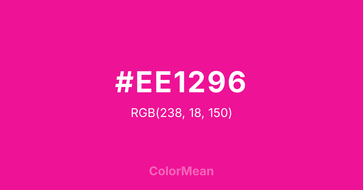 #EE1296 RGB value is (238, 18, 150). The hex color red value is 238, green is 18, and blue is 150. Its HSL format shows a hue of 324°, saturation of 87 percent, and lightness of 50 percent. The CMYK process values are 0 percent, 92 percent, 37 percent, 7 percent.