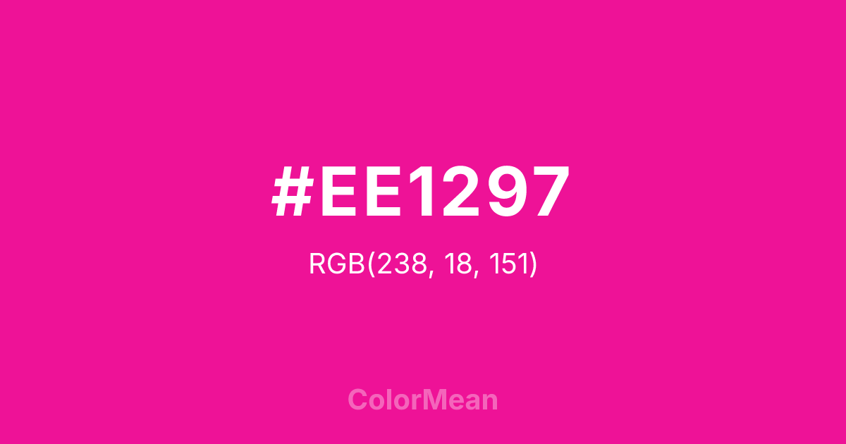 #EE1297 RGB value is (238, 18, 151). The hex color red value is 238, green is 18, and blue is 151. Its HSL format shows a hue of 324°, saturation of 87 percent, and lightness of 50 percent. The CMYK process values are 0 percent, 92 percent, 37 percent, 7 percent.