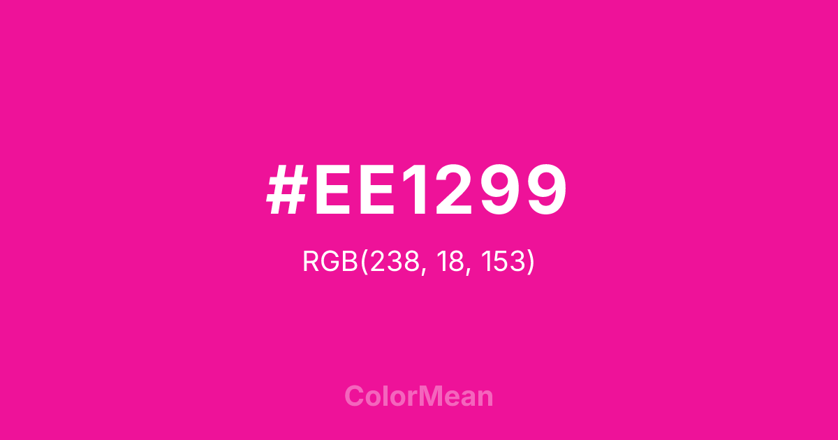#EE1299 RGB value is (238, 18, 153). The hex color red value is 238, green is 18, and blue is 153. Its HSL format shows a hue of 323°, saturation of 87 percent, and lightness of 50 percent. The CMYK process values are 0 percent, 92 percent, 36 percent, 7 percent.