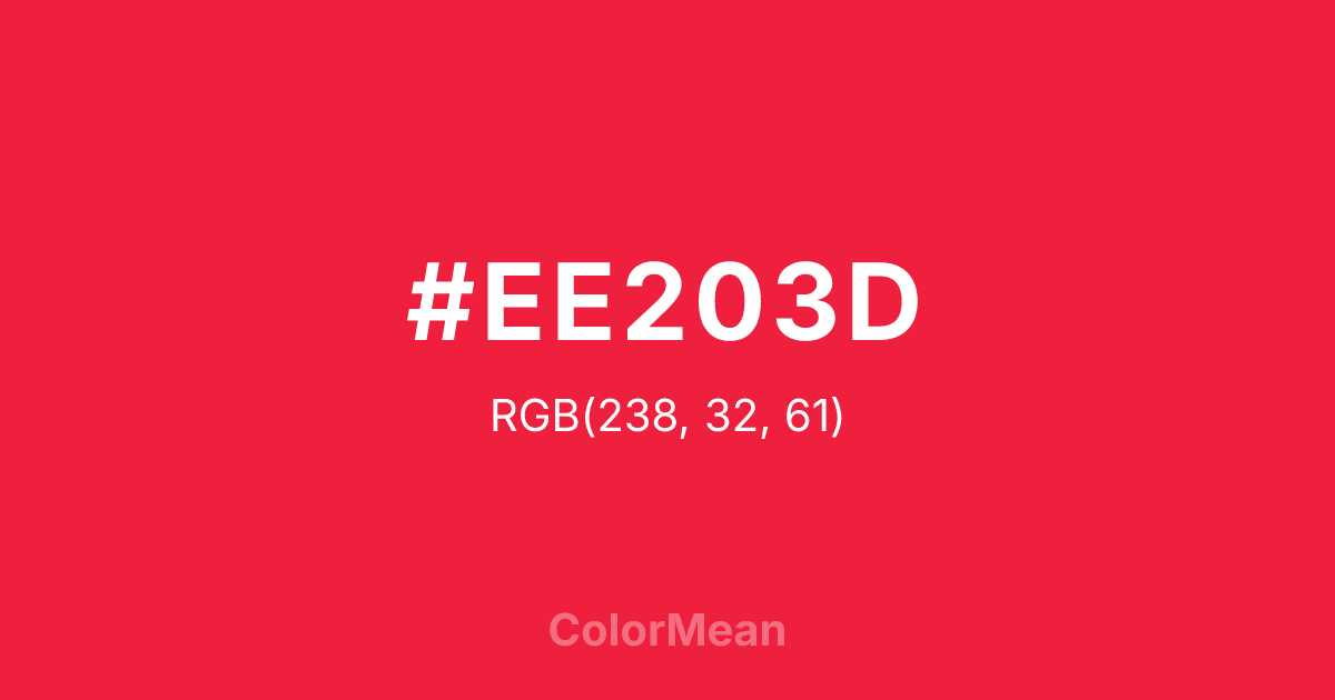 #EE203D RGB value is (238, 32, 61). The hex color red value is 238, green is 32, and blue is 61. Its HSL format shows a hue of 352°, saturation of 86 percent, and lightness of 53 percent. The CMYK process values are 0 percent, 87 percent, 74 percent, 7 percent.