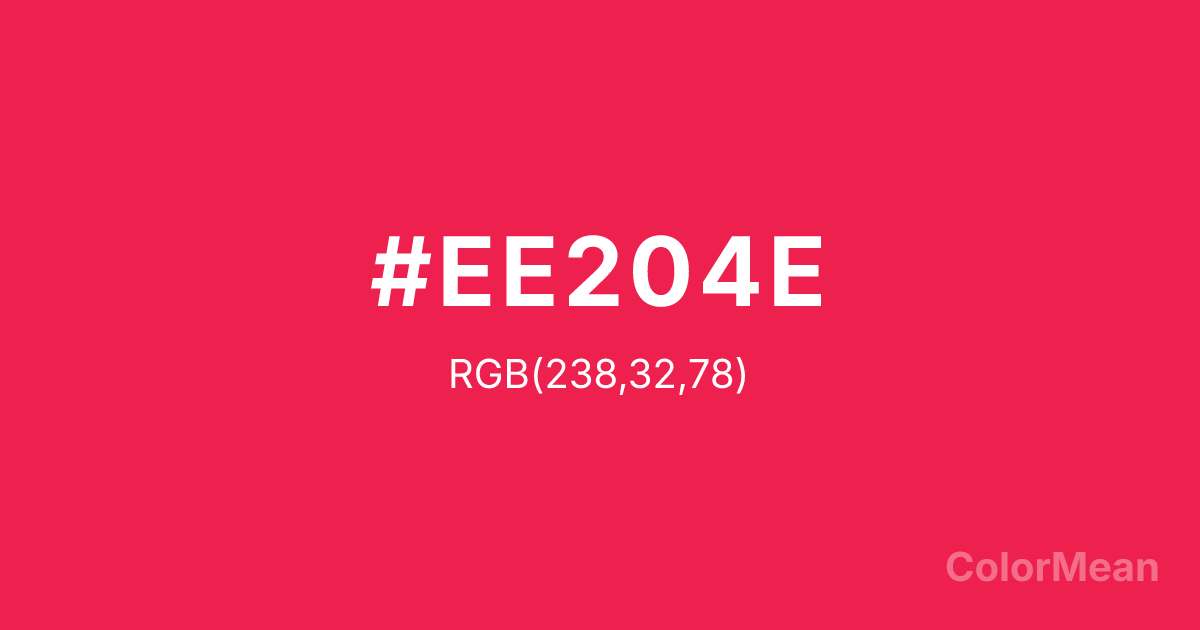#EE204E RGB value is (238, 32, 78). The hex color red value is 238, green is 32, and blue is 78. Its HSL format shows a hue of 347°, saturation of 86 percent, and lightness of 53 percent. The CMYK process values are 0 percent, 87 percent, 67 percent, 7 percent.
