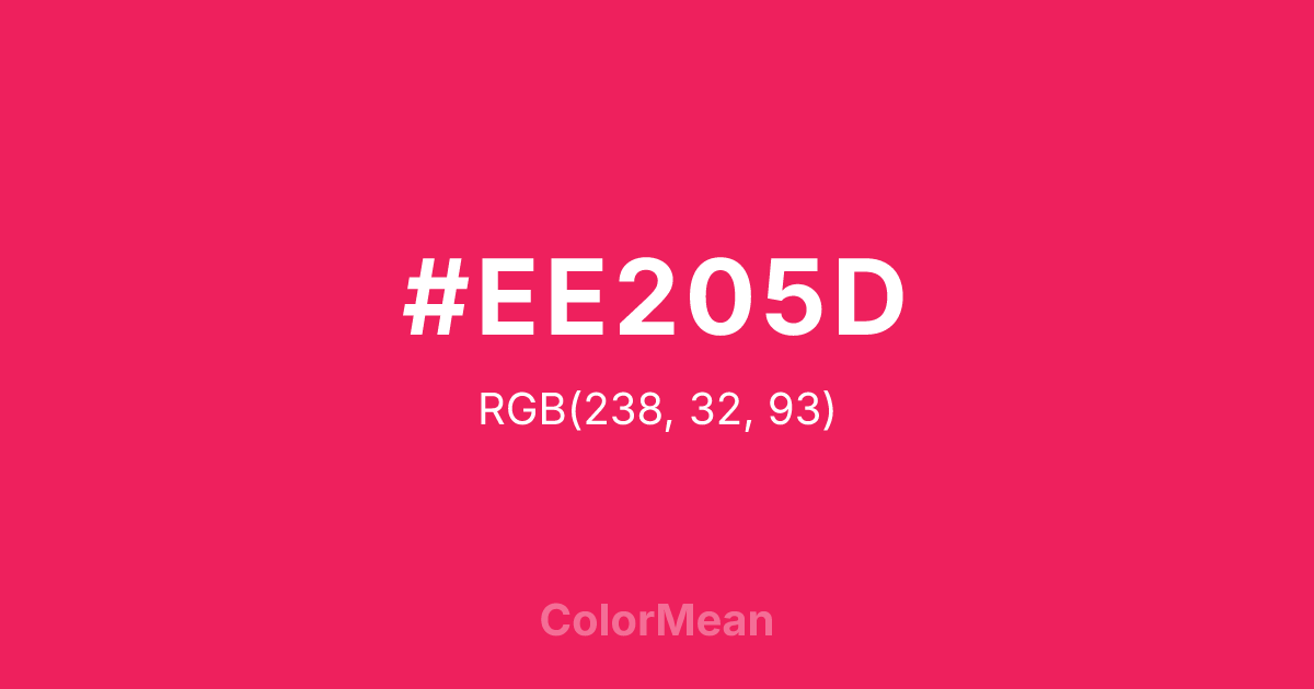#EE205D RGB value is (238, 32, 93). The hex color red value is 238, green is 32, and blue is 93. Its HSL format shows a hue of 342°, saturation of 86 percent, and lightness of 53 percent. The CMYK process values are 0 percent, 87 percent, 61 percent, 7 percent.
