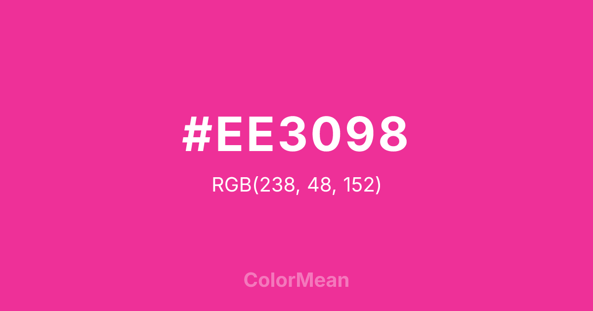 #EE3098 RGB value is (238, 48, 152). The hex color red value is 238, green is 48, and blue is 152. Its HSL format shows a hue of 327°, saturation of 85 percent, and lightness of 56 percent. The CMYK process values are 0 percent, 80 percent, 36 percent, 7 percent.