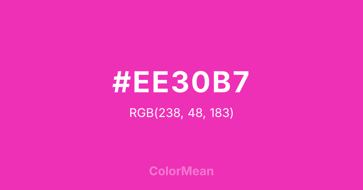 #EE30B7 RGB value is (238, 48, 183). The hex color red value is 238, green is 48, and blue is 183. Its HSL format shows a hue of 317°, saturation of 85 percent, and lightness of 56 percent. The CMYK process values are 0 percent, 80 percent, 23 percent, 7 percent.