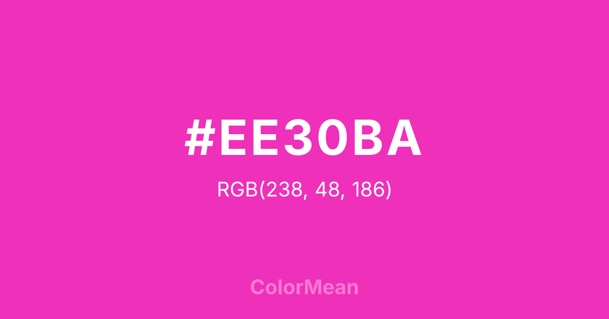 #EE30BA RGB value is (238, 48, 186). The hex color red value is 238, green is 48, and blue is 186. Its HSL format shows a hue of 316°, saturation of 85 percent, and lightness of 56 percent. The CMYK process values are 0 percent, 80 percent, 22 percent, 7 percent.