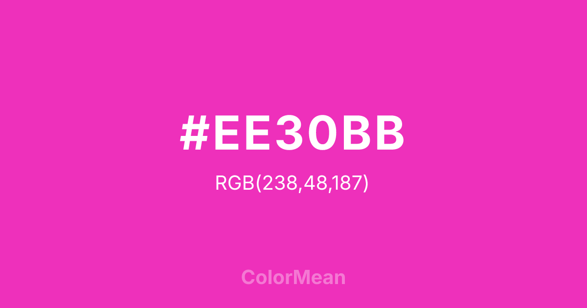 #EE30BB RGB value is (238, 48, 187). The hex color red value is 238, green is 48, and blue is 187. Its HSL format shows a hue of 316°, saturation of 85 percent, and lightness of 56 percent. The CMYK process values are 0 percent, 80 percent, 21 percent, 7 percent.