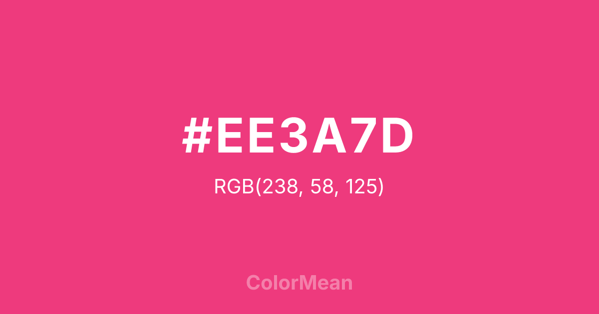 #EE3A7D RGB value is (238, 58, 125). The hex color red value is 238, green is 58, and blue is 125. Its HSL format shows a hue of 338°, saturation of 84 percent, and lightness of 58 percent. The CMYK process values are 0 percent, 76 percent, 47 percent, 7 percent.
