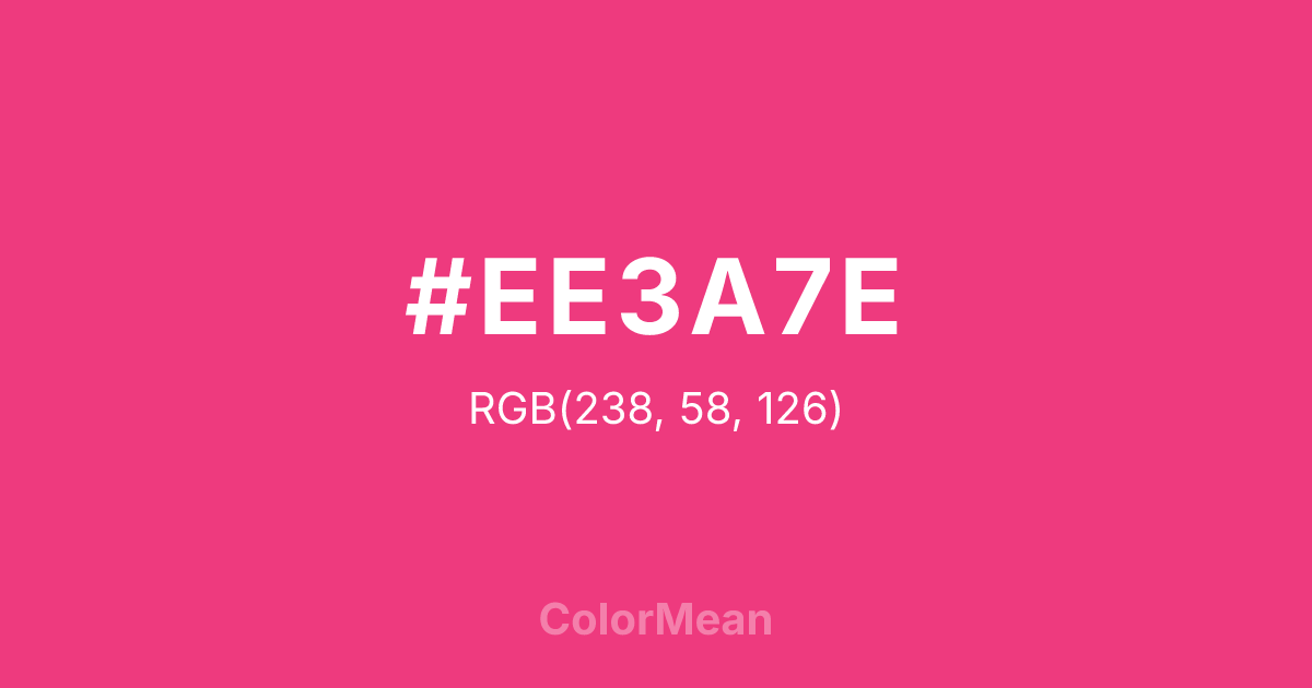 #EE3A7E RGB value is (238, 58, 126). The hex color red value is 238, green is 58, and blue is 126. Its HSL format shows a hue of 337°, saturation of 84 percent, and lightness of 58 percent. The CMYK process values are 0 percent, 76 percent, 47 percent, 7 percent.