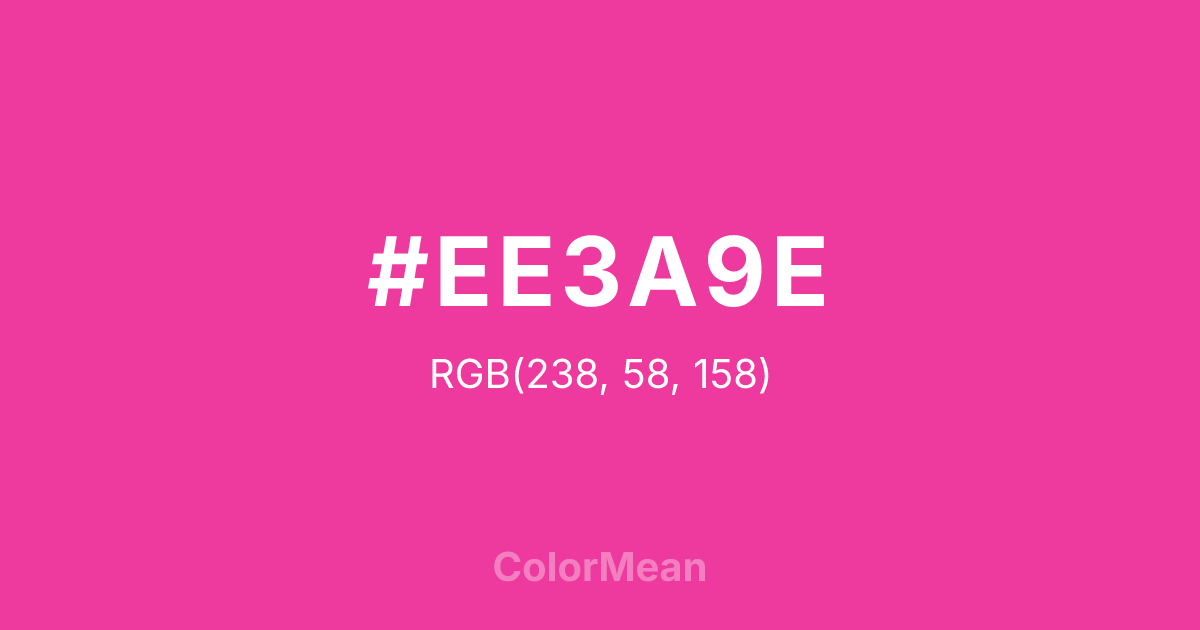 #EE3A9E RGB value is (238, 58, 158). The hex color red value is 238, green is 58, and blue is 158. Its HSL format shows a hue of 327°, saturation of 84 percent, and lightness of 58 percent. The CMYK process values are 0 percent, 76 percent, 34 percent, 7 percent.