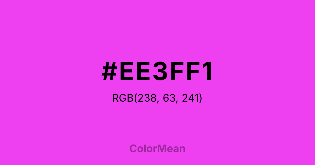 #EE3FF1 RGB value is (238, 63, 241). The hex color red value is 238, green is 63, and blue is 241. Its HSL format shows a hue of 299°, saturation of 86 percent, and lightness of 60 percent. The CMYK process values are 1 percent, 74 percent, 0 percent, 5 percent.