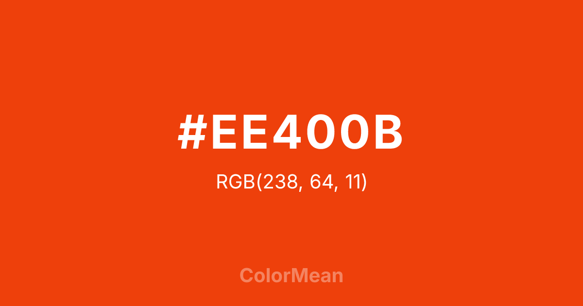 #EE400B RGB value is (238, 64, 11). The hex color red value is 238, green is 64, and blue is 11. Its HSL format shows a hue of 14°, saturation of 91 percent, and lightness of 49 percent. The CMYK process values are 0 percent, 73 percent, 95 percent, 7 percent.
