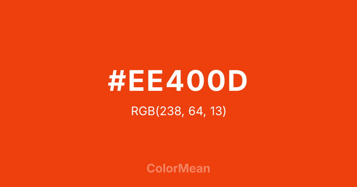 #EE400D RGB value is (238, 64, 13). The hex color red value is 238, green is 64, and blue is 13. Its HSL format shows a hue of 14°, saturation of 90 percent, and lightness of 49 percent. The CMYK process values are 0 percent, 73 percent, 95 percent, 7 percent.