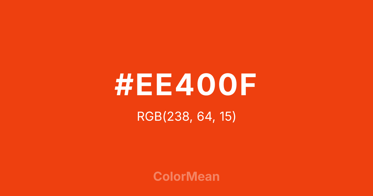 #EE400F RGB value is (238, 64, 15). The hex color red value is 238, green is 64, and blue is 15. Its HSL format shows a hue of 13°, saturation of 88 percent, and lightness of 50 percent. The CMYK process values are 0 percent, 73 percent, 94 percent, 7 percent.