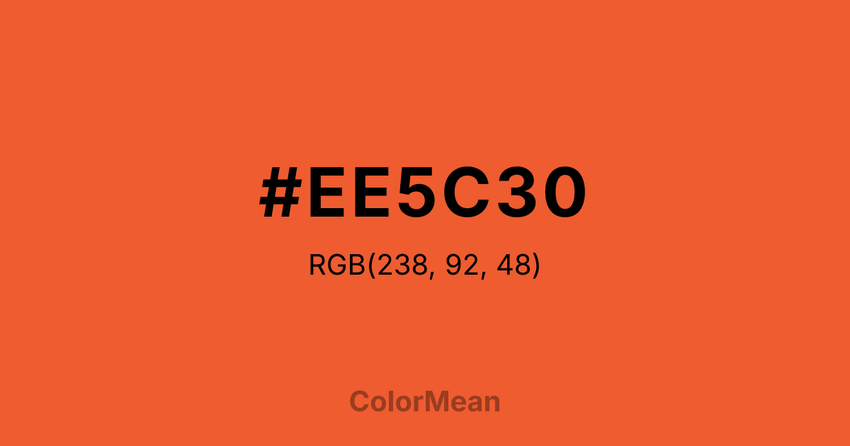 #EE5C30 RGB value is (238, 92, 48). The hex color red value is 238, green is 92, and blue is 48. Its HSL format shows a hue of 14°, saturation of 85 percent, and lightness of 56 percent. The CMYK process values are 0 percent, 61 percent, 80 percent, 7 percent.