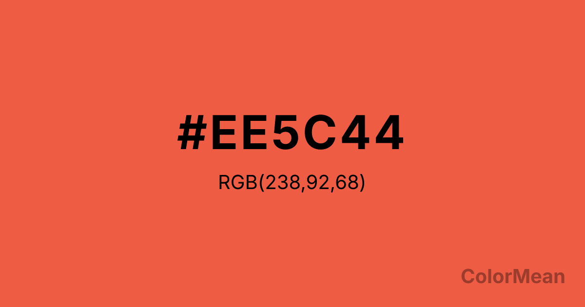 #EE5C44 RGB value is (238, 92, 68). The hex color red value is 238, green is 92, and blue is 68. Its HSL format shows a hue of 8°, saturation of 83 percent, and lightness of 60 percent. The CMYK process values are 0 percent, 61 percent, 71 percent, 7 percent.