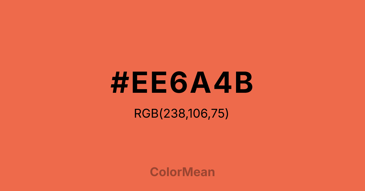 #EE6A4B RGB value is (238, 106, 75). The hex color red value is 238, green is 106, and blue is 75. Its HSL format shows a hue of 11°, saturation of 83 percent, and lightness of 61 percent. The CMYK process values are 0 percent, 55 percent, 68 percent, 7 percent.