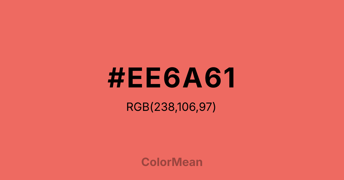 #EE6A61 RGB value is (238, 106, 97). The hex color red value is 238, green is 106, and blue is 97. Its HSL format shows a hue of 4°, saturation of 81 percent, and lightness of 66 percent. The CMYK process values are 0 percent, 55 percent, 59 percent, 7 percent.