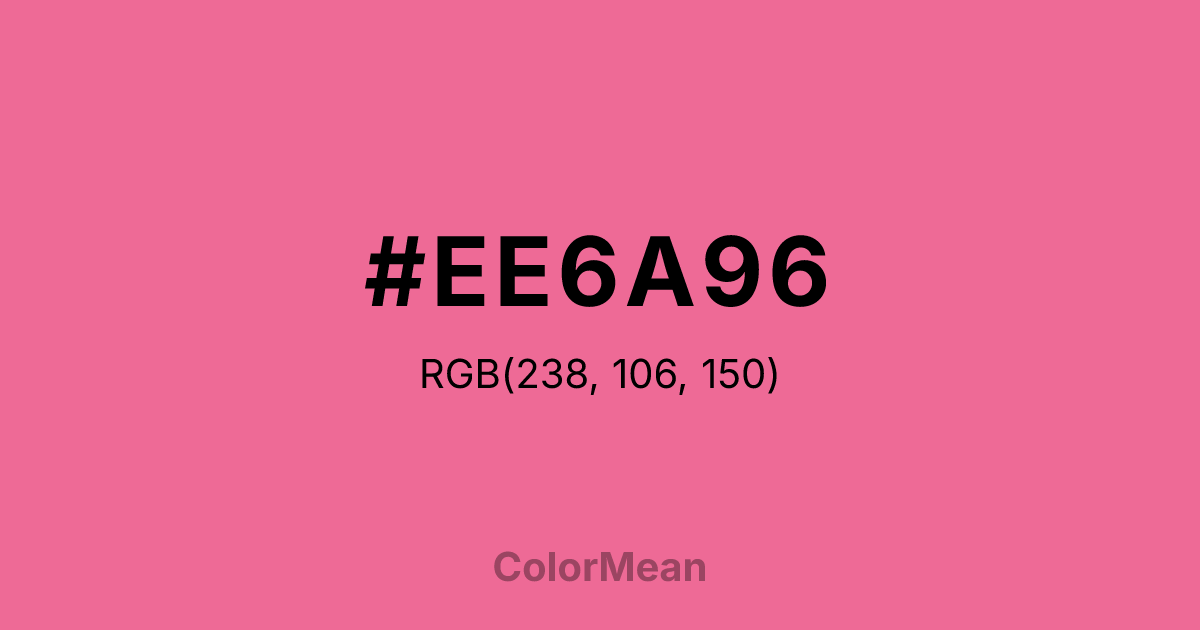 #EE6A96 RGB value is (238, 106, 150). The hex color red value is 238, green is 106, and blue is 150. Its HSL format shows a hue of 340°, saturation of 80 percent, and lightness of 67 percent. The CMYK process values are 0 percent, 55 percent, 37 percent, 7 percent.