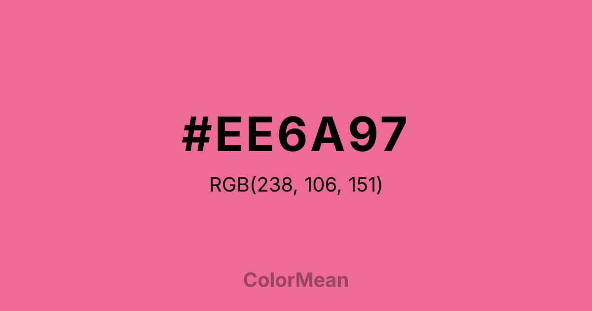 #EE6A97 RGB value is (238, 106, 151). The hex color red value is 238, green is 106, and blue is 151. Its HSL format shows a hue of 340°, saturation of 80 percent, and lightness of 67 percent. The CMYK process values are 0 percent, 55 percent, 37 percent, 7 percent.