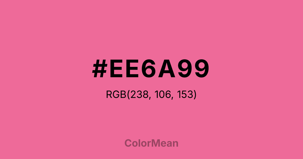#EE6A99 RGB value is (238, 106, 153). The hex color red value is 238, green is 106, and blue is 153. Its HSL format shows a hue of 339°, saturation of 80 percent, and lightness of 67 percent. The CMYK process values are 0 percent, 55 percent, 36 percent, 7 percent.