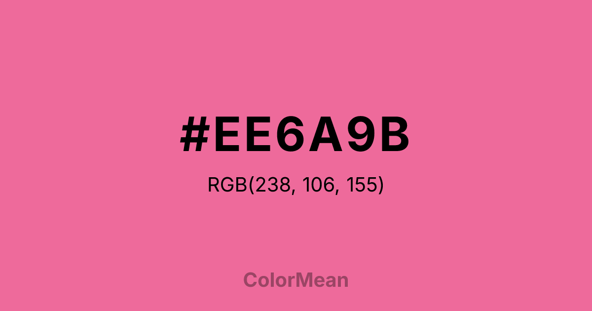 #EE6A9B RGB value is (238, 106, 155). The hex color red value is 238, green is 106, and blue is 155. Its HSL format shows a hue of 338°, saturation of 80 percent, and lightness of 67 percent. The CMYK process values are 0 percent, 55 percent, 35 percent, 7 percent.