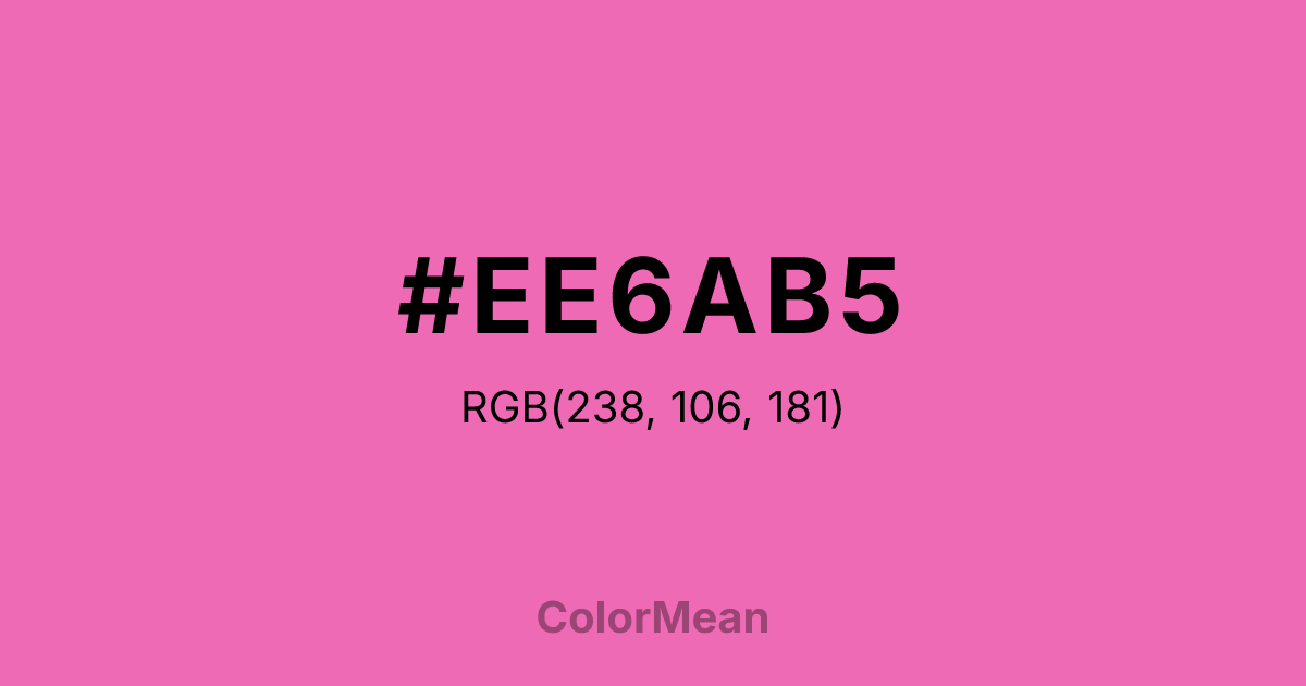 #EE6AB5 RGB value is (238, 106, 181). The hex color red value is 238, green is 106, and blue is 181. Its HSL format shows a hue of 326°, saturation of 80 percent, and lightness of 67 percent. The CMYK process values are 0 percent, 55 percent, 24 percent, 7 percent.