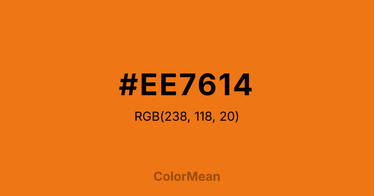 #EE7614 RGB value is (238, 118, 20). The hex color red value is 238, green is 118, and blue is 20. Its HSL format shows a hue of 27°, saturation of 87 percent, and lightness of 51 percent. The CMYK process values are 0 percent, 50 percent, 92 percent, 7 percent.