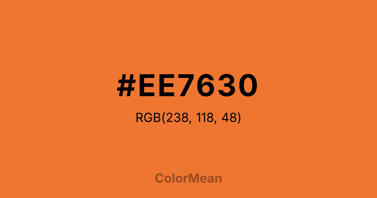 #EE7630 RGB value is (238, 118, 48). The hex color red value is 238, green is 118, and blue is 48. Its HSL format shows a hue of 22°, saturation of 85 percent, and lightness of 56 percent. The CMYK process values are 0 percent, 50 percent, 80 percent, 7 percent.