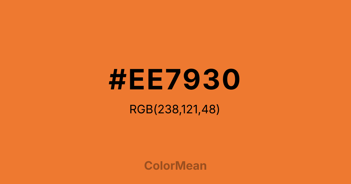 #EE7930 RGB value is (238, 121, 48). The hex color red value is 238, green is 121, and blue is 48. Its HSL format shows a hue of 23°, saturation of 85 percent, and lightness of 56 percent. The CMYK process values are 0 percent, 49 percent, 80 percent, 7 percent.