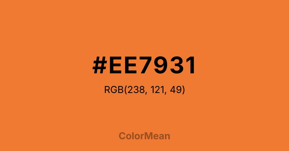 #EE7931 RGB value is (238, 121, 49). The hex color red value is 238, green is 121, and blue is 49. Its HSL format shows a hue of 23°, saturation of 85 percent, and lightness of 56 percent. The CMYK process values are 0 percent, 49 percent, 79 percent, 7 percent.