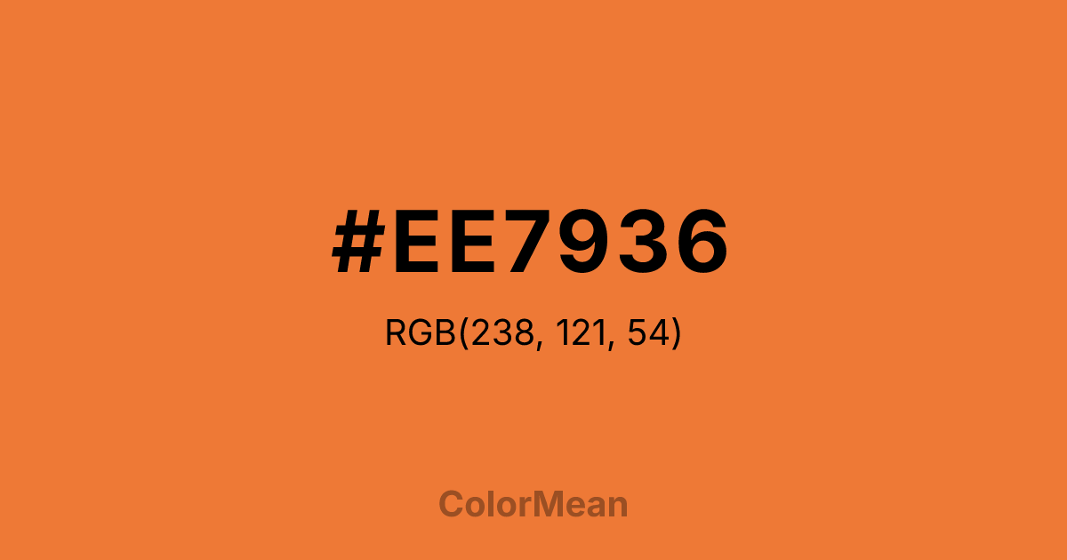 #EE7936 RGB value is (238, 121, 54). The hex color red value is 238, green is 121, and blue is 54. Its HSL format shows a hue of 22°, saturation of 84 percent, and lightness of 57 percent. The CMYK process values are 0 percent, 49 percent, 77 percent, 7 percent.