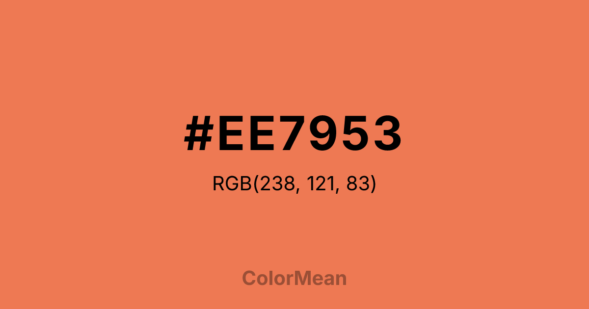 #EE7953 RGB value is (238, 121, 83). The hex color red value is 238, green is 121, and blue is 83. Its HSL format shows a hue of 15°, saturation of 82 percent, and lightness of 63 percent. The CMYK process values are 0 percent, 49 percent, 65 percent, 7 percent.