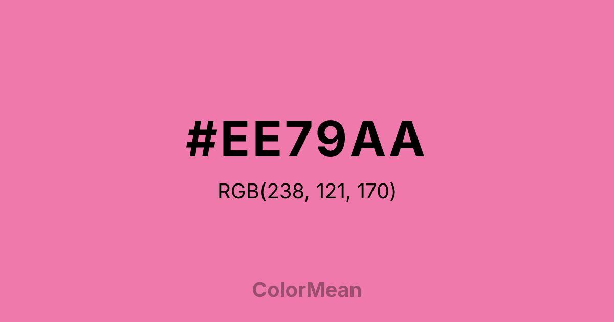 #EE79AA RGB value is (238, 121, 170). The hex color red value is 238, green is 121, and blue is 170. Its HSL format shows a hue of 335°, saturation of 77 percent, and lightness of 70 percent. The CMYK process values are 0 percent, 49 percent, 29 percent, 7 percent.