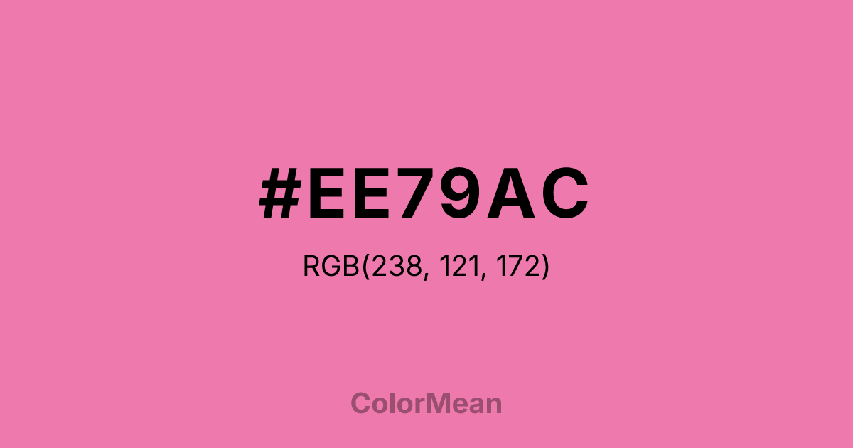 #EE79AC RGB value is (238, 121, 172). The hex color red value is 238, green is 121, and blue is 172. Its HSL format shows a hue of 334°, saturation of 77 percent, and lightness of 70 percent. The CMYK process values are 0 percent, 49 percent, 28 percent, 7 percent.