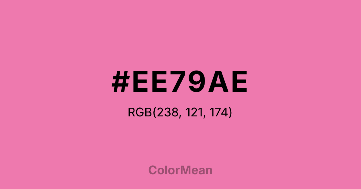 #EE79AE RGB value is (238, 121, 174). The hex color red value is 238, green is 121, and blue is 174. Its HSL format shows a hue of 333°, saturation of 77 percent, and lightness of 70 percent. The CMYK process values are 0 percent, 49 percent, 27 percent, 7 percent.
